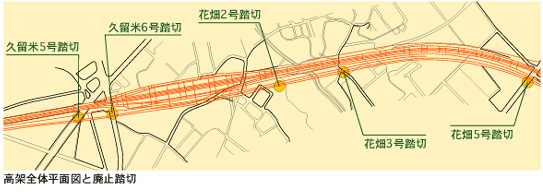 久留米市の西鉄天神大牟田線花畑駅周辺で進められている連続立体交差事業で、2004年10月17日仮線路から高架本線への切り替えが行われました。この日を期して花畑駅と試験場前駅が高架駅となり、整備中だった両駅の駅前広場も供用が開始されました。この連続立体交差事業は久留米市東町から津福本町までの天神大牟田線2.8kmが対象。福岡県が主体となって1995年に工事に着手し、2001年から仮線路での運行が行われていました。仮線路撤去を含む全体工事の完成は来年度の予定です。今回の高架化により、全部で6カ所の踏切が廃止されました。一日の通行量計4万4000台という交通量にもかかわらず、特に花畑駅周辺の踏切では朝のラッシュ時間帯である午前7時から8時の間は、なんと約20分も遮断されていたため、高架化は地元の悲願でした。