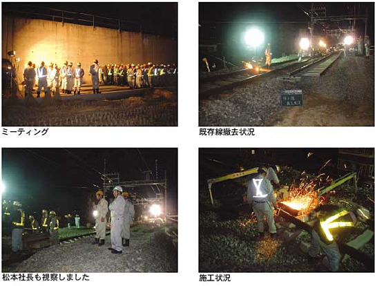 西日本鉄道(株)発注松本組担当による高架切り替え工事が10月16日夜間に行われました。松本組は松藤部長を本部長とする施工班7班を構成し、軌道部、土木久留米部、協力会社など、総勢104名体制で臨みました。午後11時施工班集合。松本社長も視察に訪れました。また、1カ月後の11月20日は同じく夜間工事にて徐行解除のための本線横移動を行いました。今後は仮線撤去工事、建造物2期施工(橋台1基・橋脚3基・擁壁2スパン)の後、11月頃の最終切替工事を経て2006年3月工事完了の予定です。