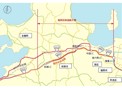 福岡前原道路は、西九州自動車の一部を形成する道路で、延長23.3kmの高規格幹線道路です。2001年10月13日には福岡高速1号線と自動車専用部が直結し、福重JCT〜前原IC間14.5kmが開通しています。このうち、福岡前原道路?V期事業として、暫定的に2車線で供用されていたI期区間(福岡市西区飯氏〜前原市大字東間7.7km)の4車線拡幅工事が完成しました。