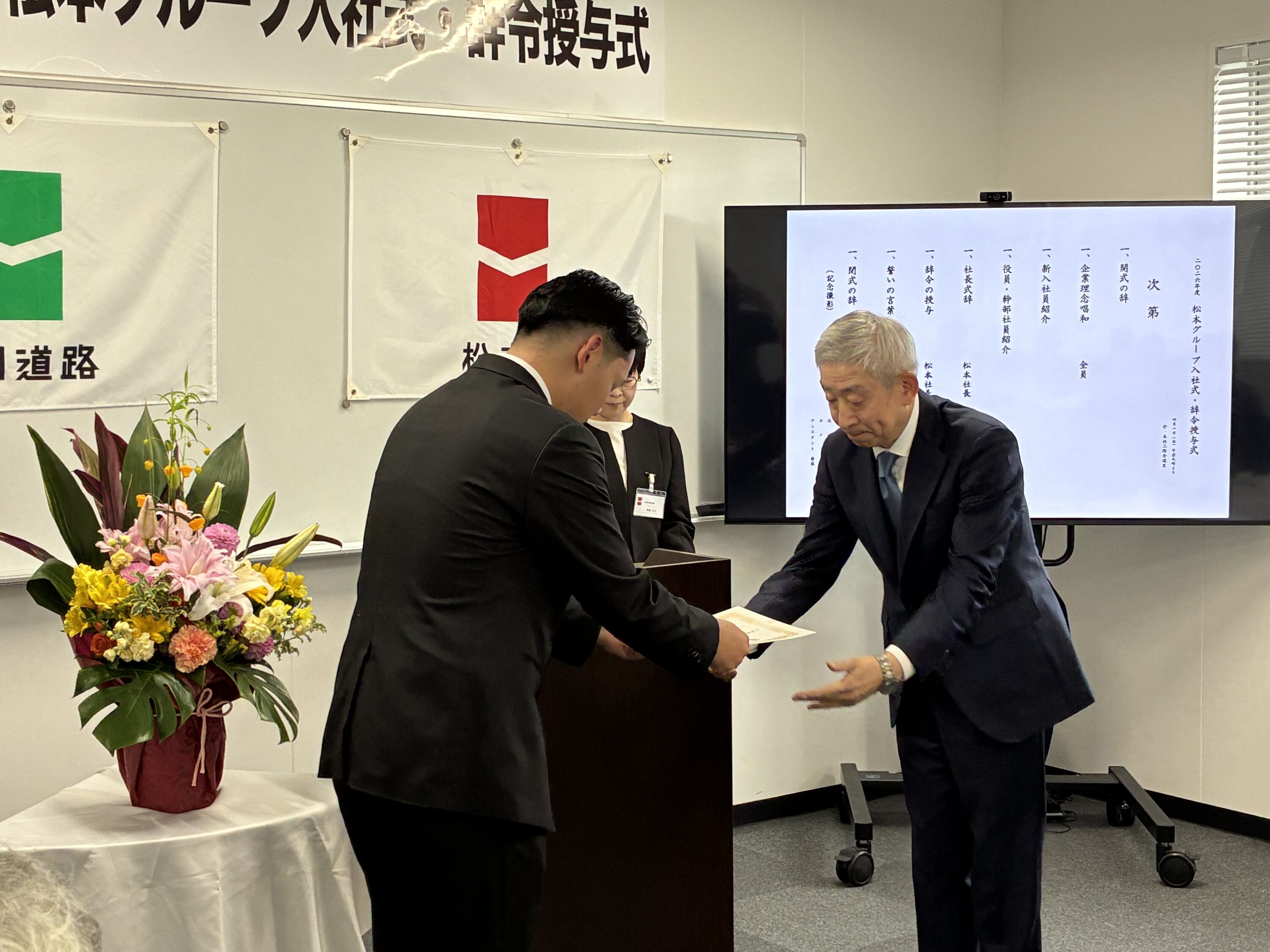 式では松本社長からの激励の言葉や辞令交付が行われ、